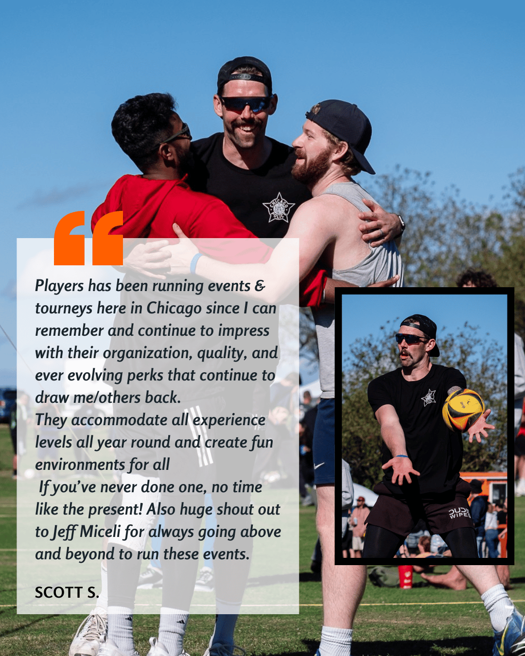 Iβve been playing in Players volleyball tournaments and leagues for the last 10 years and am always so impressed. They are beyond organized with their tournaments, are super responsive and attract great competition. 11/10 stars!!